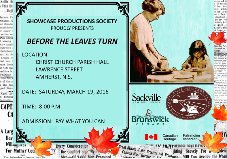 "Before the Leaves Turn" is a new play by Jamie Bradley that was commissioned by the Tantramar Heritage Trust to capture the experience of the Maritime home front during World War One. Through the prism of small town life in Sackville, NB and the experiences of two families, audiences will gain insight into this historic period. This project was made possible by funding from the Canadian Heritage Commemorate Canada Program.